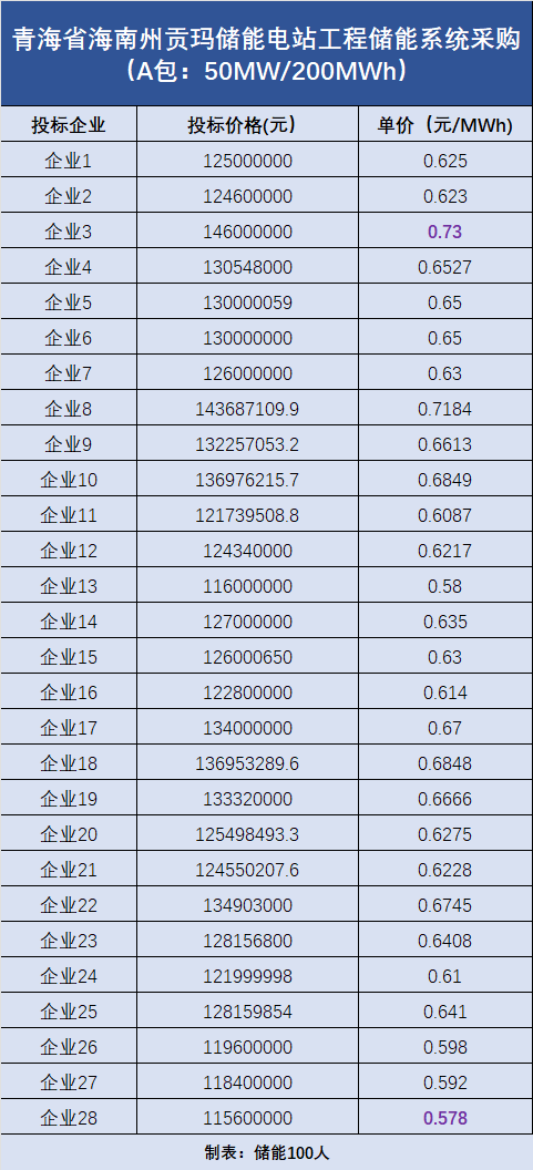 A包:容量為50MW/200MWh,共吸引了28家企業(yè)投標,最低報價為0.578元/Wh,最高報價為0.73元/Wh。(投標報價詳情見下圖)