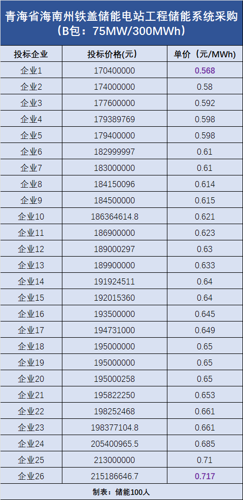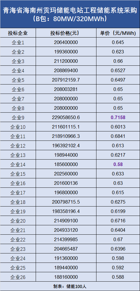 B包:容量為80MW/320MWh,共吸引了26家企業(yè)投標,最低報價為0.58元/Wh,最高報價為0.7158元/Wh。(投標報價詳情見下圖)