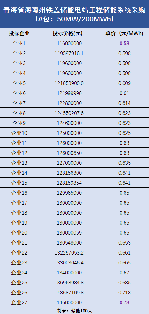 A包:容量為50MW/200MWh,共吸引了27家企業(yè)投標,最低報價為0.58元/Wh,最高報價為0.73元/Wh。(投標報價詳情見下圖)