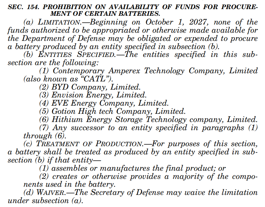 報(bào)道稱,根據(jù)美國(guó)去年年底通過的2024財(cái)年國(guó)防授權(quán)法案,美國(guó)國(guó)防部將被禁止從寧德時(shí)代、比亞迪、遠(yuǎn)景能源、億緯鋰能、國(guó)軒高科、海辰儲(chǔ)能等6家中國(guó)企業(yè)采購(gòu)電池。該禁令將于2027年10月生效。不過,這項(xiàng)禁令并不適用于商業(yè)采購(gòu),比如美國(guó)福特公司正從寧德時(shí)代獲得技術(shù)許可,在密歇根州生產(chǎn)電動(dòng)汽車電池,特斯拉公司的部分電池也來自比亞迪。