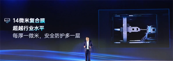 在安全防護(hù)方面,億緯鋰能也有多重創(chuàng)新設(shè)計(jì),首先在電池隔膜方面選擇了14微米復(fù)合膜,超越行業(yè)水平。與此同時(shí),億緯還開發(fā)了具有熱關(guān)斷的效應(yīng)的特殊隔膜涂層,當(dāng)溫度達(dá)到臨界值,涂層顆粒會(huì)融化關(guān)斷鋰離子的遷移,從源頭阻斷電芯熱失控的發(fā)生。