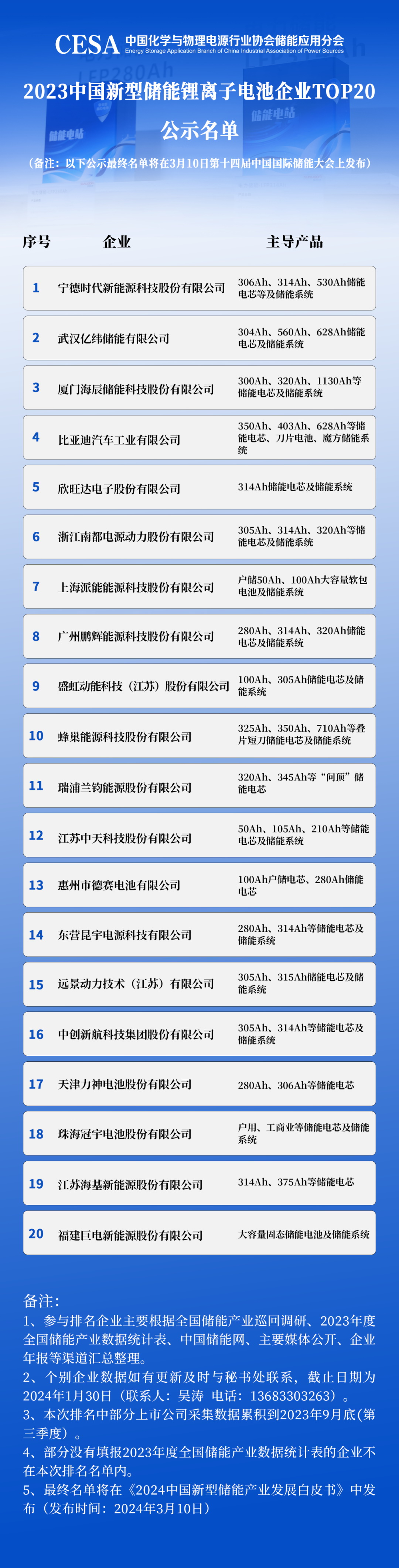 本次儲(chǔ)能產(chǎn)業(yè)鏈百強(qiáng)企業(yè)評(píng)選活動(dòng)針對(duì)的對(duì)象主要是 CESA 儲(chǔ)能應(yīng)用分會(huì)廣大會(huì)員企業(yè)和與儲(chǔ)能業(yè)務(wù)緊密相關(guān)的上市公司,評(píng)價(jià)數(shù)據(jù)以2023年為準(zhǔn),主要通過協(xié)會(huì)實(shí)地走訪調(diào)研、會(huì)員企業(yè)年度數(shù)據(jù)申報(bào)、媒體披露和上市公司年報(bào)等多個(gè)渠道,最終形成2023中國(guó)新型儲(chǔ)能鋰離子電池企業(yè)TOP20、2023中國(guó)新型儲(chǔ)能系統(tǒng)集成企業(yè)TOP30、2023中國(guó)新型儲(chǔ)能PCS企業(yè)TOP30、2023中國(guó)新型儲(chǔ)能液流電池企業(yè)TOP30、2023中國(guó)工商業(yè)儲(chǔ)能企業(yè)TOP60、2023中國(guó)新型儲(chǔ)能BMS企業(yè)TOP10、2023中國(guó)新型儲(chǔ)能飛輪儲(chǔ)能企業(yè)TOP10、2023中國(guó)新型儲(chǔ)能溫控系統(tǒng)企業(yè)TOP20、2023中國(guó)新型儲(chǔ)能消防與安全企業(yè)TOP 20、2023中國(guó)新型儲(chǔ)能壓縮空氣儲(chǔ)能企業(yè)TOP10及2023中國(guó)新型儲(chǔ)能產(chǎn)業(yè)企業(yè)TOP100名單。