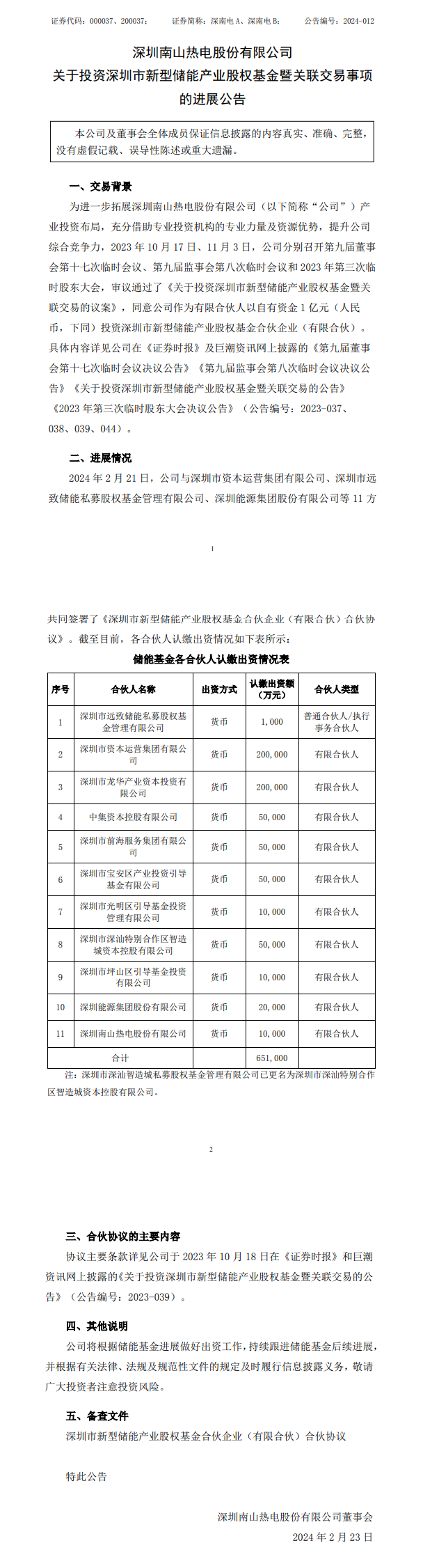 近日,深圳南山熱電股份有限公司發(fā)布《關(guān)于投資深圳市新型儲能產(chǎn)業(yè)股權(quán)基金暨關(guān)聯(lián)交易事項的進(jìn)展公告》。