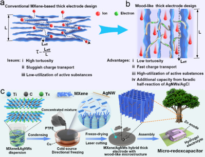 圖3.a) 具有密堆積結(jié)構(gòu)的傳統(tǒng)MXene厚電極設(shè)計(jì)與b)具有類木質(zhì)微結(jié)構(gòu)的MXene/AgNWs混合厚電極設(shè)計(jì)在結(jié)構(gòu)和功能上的優(yōu)勢比較;c) 類木MXene/AgNWs混合厚電極的制備過程和微型氧化還原電容器的組裝示意圖。