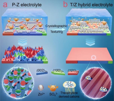 圖2. 在a)純ZnSO4電解質(zhì)和b)含有微量茶堿添加劑的優(yōu)化混合電解質(zhì)中,鋅陽極表面的鍍鋅行為示意圖.