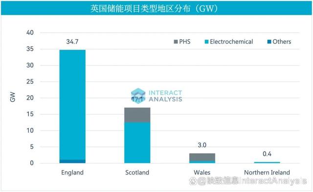 英國是全球重要的新型儲能市場,與德意等以戶儲為主的歐洲國家不同,大規(guī)模儲能在英國占據(jù)主導(dǎo)地位。據(jù)Interact Analysis全球儲能項(xiàng)目統(tǒng)計(jì),截至2023年底,英國儲能項(xiàng)目總規(guī)模約55GW(含在規(guī)劃、在建及已投運(yùn)的儲能項(xiàng)目),其中規(guī)劃及在建項(xiàng)目50GW。抽水蓄能項(xiàng)目總規(guī)模約6.7GW,新型儲能項(xiàng)目規(guī)模超48GW。