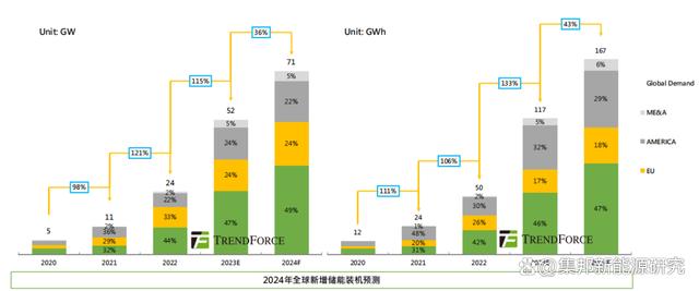 展望2024年,TrendForce集邦咨詢預(yù)計(jì),24年全球儲(chǔ)能新增裝機(jī)有望達(dá)71GW/167GWh,同比增長(zhǎng)36%/43%,保持高增。