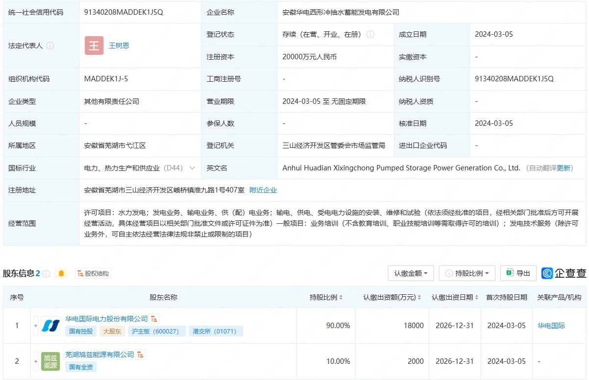 企查查股權(quán)穿透顯示,該公司由華電國(guó)際、蕪湖鳩茲能源有限公司共同持股。