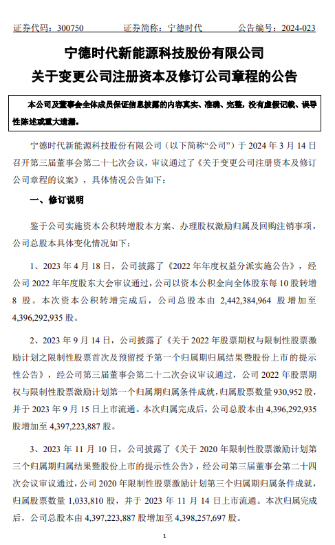 近日,寧德時代發(fā)布《關于變更公司注冊資本及修訂公司章程的公告》。