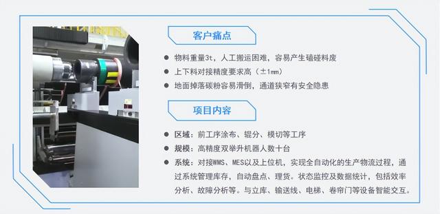 在某儲能頭部企業(yè)實現(xiàn)產(chǎn)線物流無人化的項目中,磅旗無人工場數(shù)字化方案籠罩前段與中段產(chǎn)線物流全過程,包含涂布上下料、極卷緩存搬運、輥壓分切上料、輥壓分切下料、模切上下料、卷繞上料、隔閡運輸、空卷筒回流運輸?shù)裙に囘^程。實現(xiàn)全過程主動化、無人化、物料多級智能拉動、上下工序智能協(xié)同。
