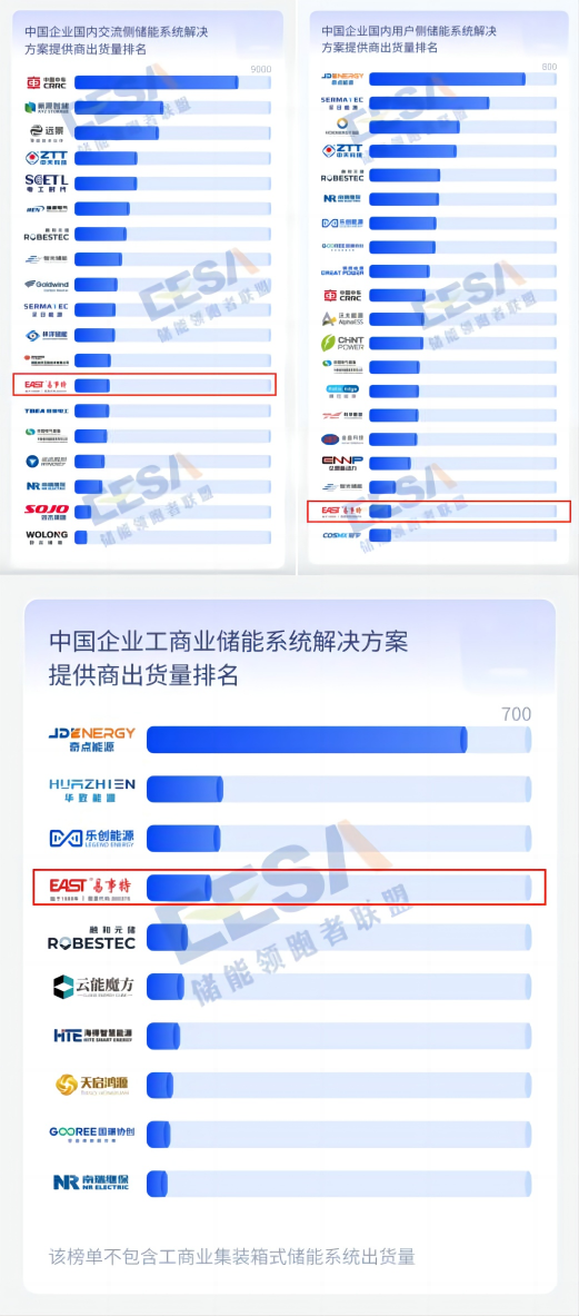 會(huì)上,儲(chǔ)能領(lǐng)跑者聯(lián)盟(EESA)還權(quán)威發(fā)布了“2023年度中國(guó)儲(chǔ)能企業(yè)全球出貨量排名”,易事特集團(tuán)榮登多項(xiàng)行業(yè)榜單,包括2023年中國(guó)企業(yè)國(guó)內(nèi)交流側(cè)儲(chǔ)能系統(tǒng)解決方案提供商出貨量TOP20、中國(guó)企業(yè)國(guó)內(nèi)用戶側(cè)儲(chǔ)能系統(tǒng)解決方案提供商出貨量TOP20、中國(guó)企業(yè)工商業(yè)儲(chǔ)能系統(tǒng)解決方案提供商出貨量TOP10。