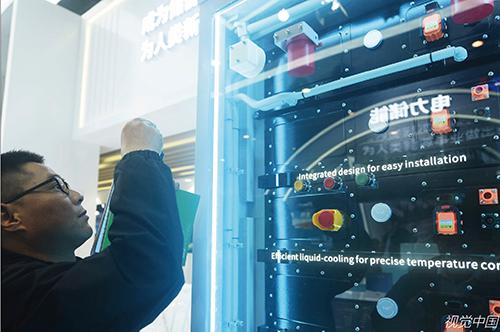 2024年3月11日,杭州,觀眾在中國國際儲能大會(huì)參觀億緯鋰能的液冷儲能設(shè)施。