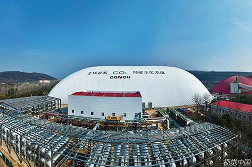 2024年1月9日,安徽省蕪湖市,繁昌區(qū)繁陽鎮(zhèn)庫山村,航拍正在并網(wǎng)發(fā)電的海螺集團(tuán)10MW/80MWh二氧化碳儲能示范系統(tǒng)項(xiàng)目。