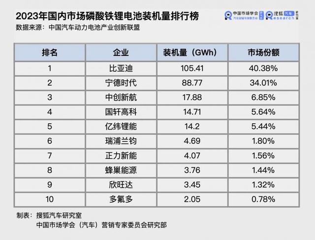 在動力電池領域、特別是磷酸鐵鋰電池領域,寧德時代面對著來自比亞迪強有力的挑戰(zhàn)。中國汽車動力電池產業(yè)創(chuàng)新聯(lián)盟公布的數據顯示,2023年比亞迪磷酸鐵鋰動力電池的裝機量已經超過寧德時代,拿下40%以上的市場份額。