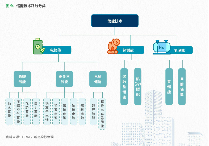 儲(chǔ)能,是指通過(guò)不同方式、利用特定的裝置或物理介質(zhì),將不同形式的能量?jī)?chǔ)存起來(lái),以便在需要時(shí)利用的技術(shù)。根據(jù)技術(shù)路徑不同,儲(chǔ)能形式主要分為電儲(chǔ)能、熱儲(chǔ)能和氫儲(chǔ)能三大類(lèi),其中電化學(xué)與物理儲(chǔ)能為現(xiàn)階段主要技術(shù)路線。儲(chǔ)能系統(tǒng)是新型電力系統(tǒng)有效的調(diào)峰調(diào)頻、平滑波動(dòng)手段及重要的備用資源,大力發(fā)展儲(chǔ)能對(duì)提高光伏、風(fēng)電等可再生能源利用率,實(shí)現(xiàn)“雙碳”目標(biāo)具有重要意義。