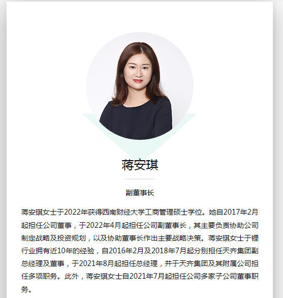 資料顯示,蔣安琪在鋰行業(yè)擁有近10年工作經(jīng)驗(yàn),自2016年2月、2018年7月起分別擔(dān)任天齊集團(tuán)副總經(jīng)理、董事,并于2021年8月至2023年6月?lián)翁忑R集團(tuán)總經(jīng)理,她同時(shí)在天齊集團(tuán)及其附屬公司擔(dān)任多項(xiàng)職務(wù)。此外,蔣安琪自2021年7月起擔(dān)任天齊鋰業(yè)多家子公司董事職務(wù)。