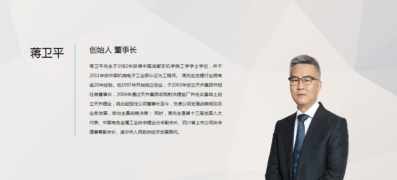 蔣衛(wèi)平為公司創(chuàng)始人及實(shí)際控制人,自2007年12月起擔(dān)任公司董事長,主要負(fù)責(zé)公司全面戰(zhàn)略規(guī)劃及業(yè)務(wù)發(fā)展,并負(fù)責(zé)主要戰(zhàn)略決策。蔣衛(wèi)平為公司規(guī)范運(yùn)作和長期健康發(fā)展發(fā)揮了積極作用。此外,蔣衛(wèi)平憑借前瞻性的戰(zhàn)略眼光和豐富的行業(yè)及管理實(shí)踐,帶領(lǐng)公司積極布局全球鋰電材料資源和加工產(chǎn)能,使公司逐步發(fā)展成為全球鋰行業(yè)的頭部企業(yè)?;谑Y衛(wèi)平為公司發(fā)展做出的杰出貢獻(xiàn),董事會(huì)同意聘任蔣衛(wèi)平為公司董事會(huì)名譽(yù)主席,繼續(xù)就公司戰(zhàn)略規(guī)劃及業(yè)務(wù)發(fā)展作出指導(dǎo)和決策支持。