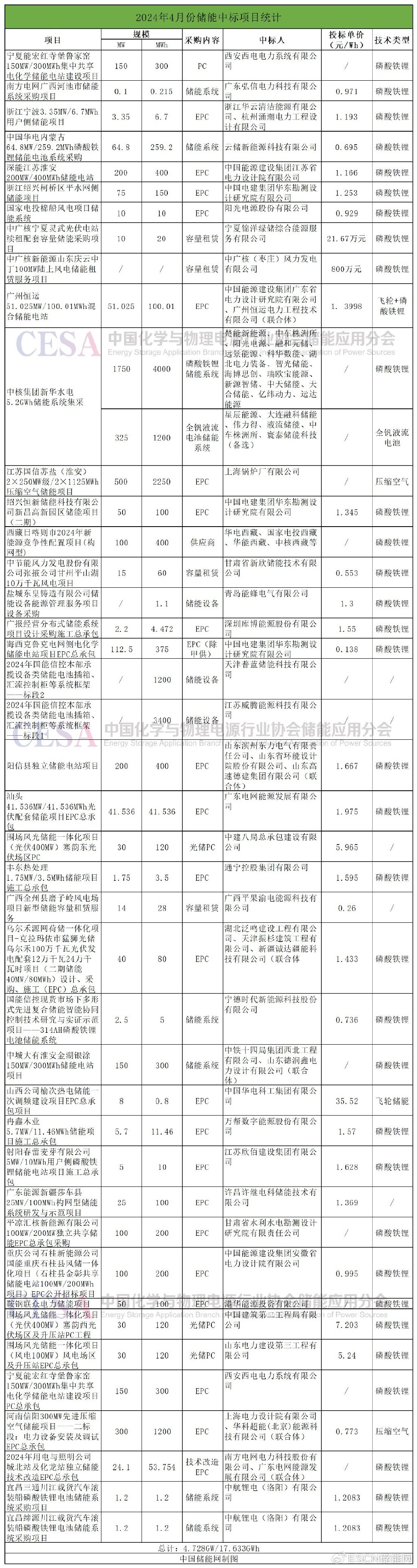 據(jù)中國(guó)儲(chǔ)能網(wǎng)不完全統(tǒng)計(jì),4月份共有32.359GWh儲(chǔ)能招標(biāo)項(xiàng)目開(kāi)標(biāo),容量規(guī)模是上個(gè)月的2.1倍,其中完成招標(biāo)的項(xiàng)目規(guī)模共4.728GW/17.633GWh,另外,有14.726GWh 容量規(guī)模的儲(chǔ)能招標(biāo)項(xiàng)目公布了中標(biāo)候選人。