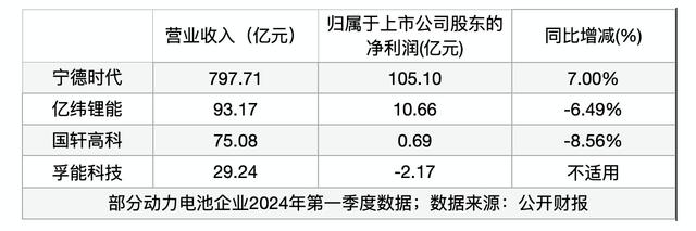 以2024年第一季度為例,頭部企業(yè)寧德時代營收、凈利潤超過百億元,中部企業(yè)差異顯著,尤其凈利潤表現(xiàn)斷層,其中億緯鋰能超10億元凈利潤,而孚能科技則為凈虧損。