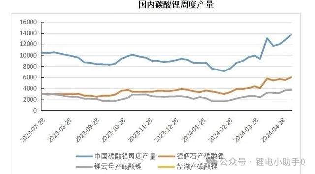 4月國內(nèi)主要正極材料產(chǎn)量均有增長,其中用量最大的磷酸鐵鋰正極材料產(chǎn)量環(huán)比增長28%,錳酸鋰產(chǎn)量環(huán)比增長63.8%,鈷酸鋰產(chǎn)量環(huán)比增長12%,帶動國內(nèi)碳酸鋰需求增長。