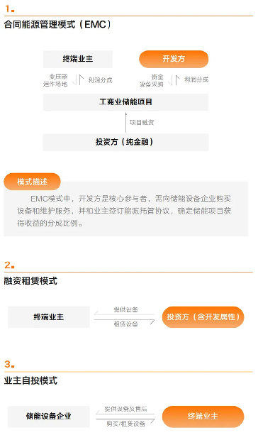 開發(fā)模式也更加清晰。工商業(yè)儲能項(xiàng)目開發(fā)模式有3種:合同能源管理模式(EMC)、融資租賃模式、業(yè)主自投模式。