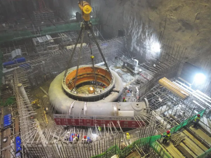 浙江天臺抽水蓄能電站1號機(jī)組座環(huán)蝸殼吊裝現(xiàn)場 (三峽建工供圖)
