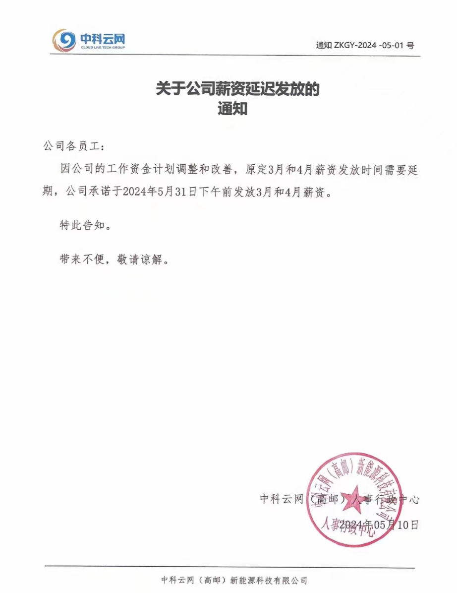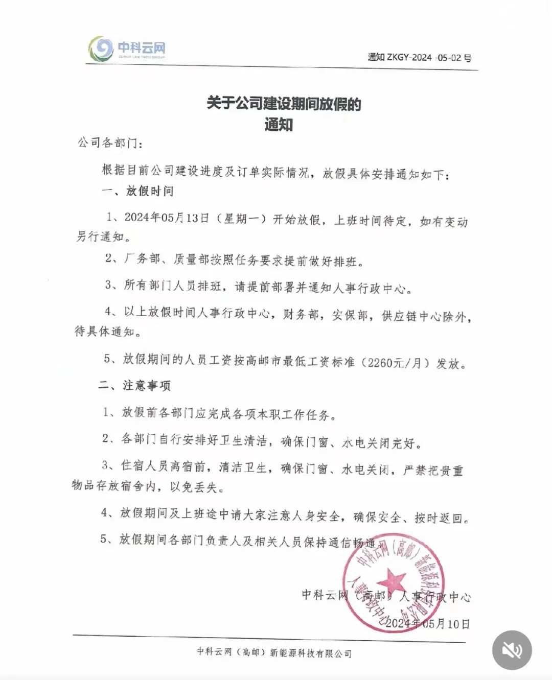 證券時報·e公司記者注意到,近日,有網友通過社交平臺發(fā)布了中科云網(高郵)新能源科技有限公司(下稱“中科高郵”)拖欠員工工資并放假的消息。