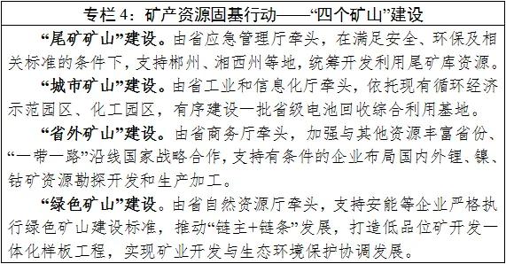統(tǒng)籌開展鋰電池及先進儲能材料產(chǎn)業(yè)所需鋰、錳、鎳等主要礦產(chǎn)資源調(diào)查評價及勘查,加強新能源礦產(chǎn)資源儲備和統(tǒng)籌開發(fā)利用。建設(shè)“尾礦礦山”,在滿足安全、環(huán)保及相關(guān)標準的條件下,支持開發(fā)利用尾礦庫資源。建設(shè)“城市礦山”,依托現(xiàn)有循環(huán)經(jīng)濟示范園區(qū)、省級化工園區(qū),有序建設(shè)一批電池回收綜合利用示范基地。加強與其他資源豐富省份戰(zhàn)略合作,支持有條件的企業(yè)布局建設(shè)“省外礦山”,提升資源供應保障能力。