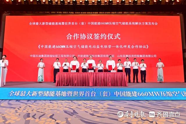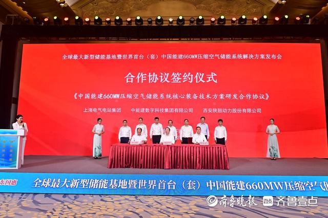 會(huì)上,中國(guó)能建數(shù)科集團(tuán)發(fā)布《世界首臺(tái)(套)中國(guó)能建660MW壓縮空氣儲(chǔ)能系統(tǒng)解決方案》,并介紹了中國(guó)能建在山東省建設(shè)3060MW儲(chǔ)能基地的規(guī)劃布局及賦能“西電東送”新圖景。山東國(guó)惠投資控股集團(tuán)有限公司、中國(guó)石油集團(tuán)渤海鉆探工程有限公司、陜西鼓風(fēng)機(jī)(集團(tuán))有限公司、上海電氣電站集團(tuán)等項(xiàng)目合作企業(yè),與中國(guó)能建數(shù)科集團(tuán)共同簽訂了《中國(guó)能建660MW壓縮空氣儲(chǔ)能系統(tǒng)核心裝備技術(shù)方案研發(fā)合作協(xié)議》等三項(xiàng)合作協(xié)議,標(biāo)志著圍繞壓縮空氣儲(chǔ)能的又一“政企合作、央地共建”典范項(xiàng)目正式吹響集結(jié)號(hào)。