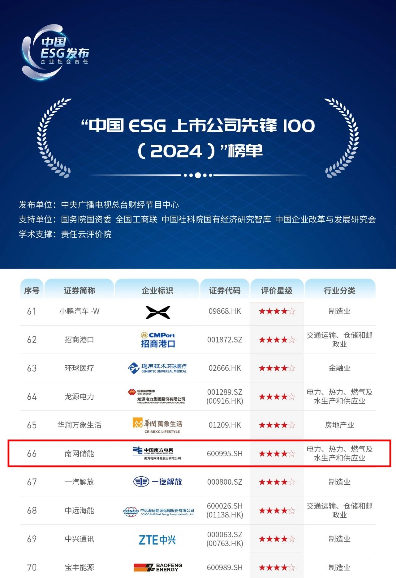 近日,中央廣播電視總臺(tái)財(cái)經(jīng)節(jié)目中心在北京正式發(fā)布《2024年度ESG行動(dòng)報(bào)告》,入圍《報(bào)告》的100家“中國(guó)ESG上市公司先鋒100”企業(yè)中,南方電網(wǎng)儲(chǔ)能股份有限公司(以下簡(jiǎn)稱“南網(wǎng)儲(chǔ)能”)憑借在環(huán)境、社會(huì)和公司治理等方面的履責(zé)成效,從6471家中國(guó)上市公司樣本池、972家上市公司評(píng)價(jià)樣本中脫穎而出,蟬聯(lián)該榜單,位列第66位,較去年排名提升26位。