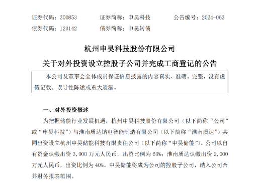 7月11日,杭州申昊科技股份有限公司發(fā)布關(guān)于對外投資設(shè)立控股子公司并完成工商登記的公告。公告顯示,為把握儲能行業(yè)發(fā)展機(jī)遇,杭州申昊科技股份有限公司(以下簡稱“申昊科技”)與淮南質(zhì)達(dá)鈉電智能制造有限公司(以下簡稱“淮南質(zhì)達(dá)”)共同出資設(shè)立杭州申昊儲能科技有限責(zé)任公司(以下簡稱“申昊儲能”),從事包括戶儲、工商業(yè)儲能、電網(wǎng)側(cè)儲能等業(yè)務(wù),擬研發(fā)虛擬電網(wǎng)技術(shù)和應(yīng)用,進(jìn)一步提升儲能資源的聚合和管控,實現(xiàn)數(shù)字能源新業(yè)態(tài),培育公司新的業(yè)務(wù)增長點。