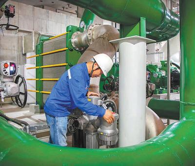 工作人員在壓縮空氣儲(chǔ)能電站調(diào)試壓縮機(jī)閉式冷卻水系統(tǒng)閥門(mén)。 丁小偉攝