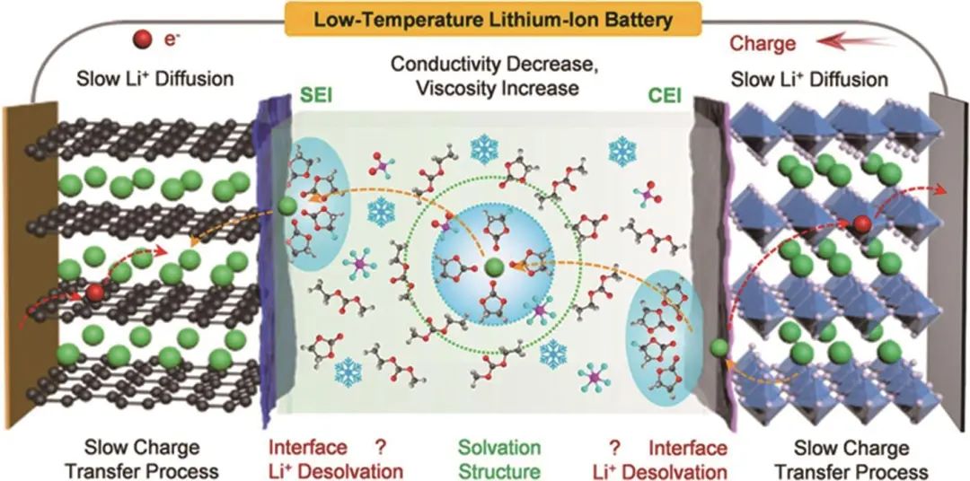 鋰電池低溫性能衰退的原因機理如圖2所示,主要是:①低溫下電解液的電導率下降,黏度上升,阻礙了Li+在電解液內的遷移;②Li+在負極(例如石墨、硅、鋰金屬)或正極(例如LiNixMnyCo1-x-yO2)中的擴散系數(shù)在低溫下下降,導致從電極擴散到電解液內的Li+減少;③低溫下電荷轉移過程更加困難,電荷轉移電阻(Rct)顯著提高,并且Li+在SEI和CEI內的擴散系數(shù)下降。這三個原因分別從主體電解液中遷移、電極內部擴散以及界面電荷轉移三個方面阻礙了鋰電池的正常運行,造成了電池極化效應的增大,從而降低了電池的放電容量和循環(huán)性能。