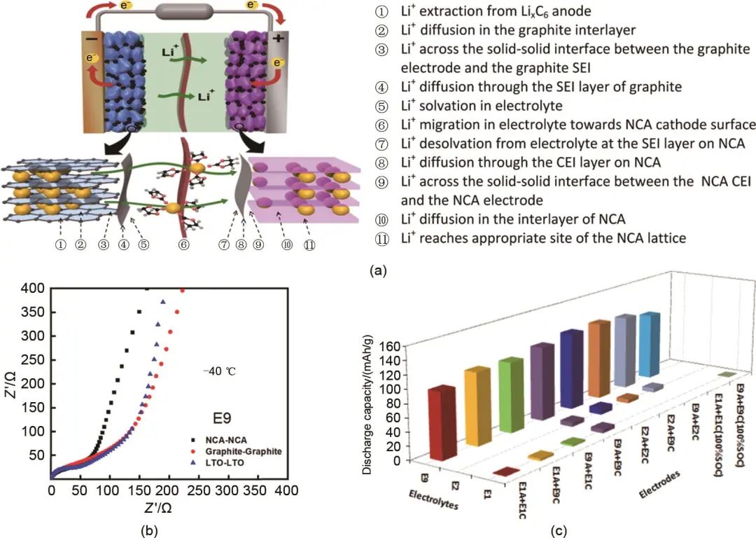 充電過程中石墨負極表面發(fā)生鋰沉積是造成LIBs在低溫下充電困難和循環(huán)性能衰減的重要原因,但是其并不是LIBs低溫放電容量衰退的主要原因,因為在相同條件下LIBs在低溫下可以順利地進行負極的鋰脫嵌(放電)。為了尋找低溫下鋰電池放電容量衰退的根本原因,Zhang等利用電化學阻抗譜(EIS)分析了低溫下LIBs的主體電阻(Rb)、SEI電阻(Rsei)以及電荷轉移電阻(Rct)的變化情況,實驗發(fā)現(xiàn)當溫度低于10 ℃時,LIBs的Rct顯著增加,而Rb和Rsei增大不明顯,由此證明低溫下電荷轉移過程中的Rct是影響電池性能的主導,而由于低溫導致的電導率下降和黏度上升等造成的Rb上升并不是低溫性能衰退的最主要原因。電荷轉移電阻Rct的提高主要是因為低溫下鋰離子在充放電過程中發(fā)生電極反應時的電荷轉移能壘阻礙變大。Li等將整個放電過程中鋰離子從負極遷移到正極的全部過程總結如圖4(a)所示,其中發(fā)生在電極和電解液主體的步驟①、②、⑩、 和⑥產生的電阻分別為Rb和Rsei,而在電極-電解液界面上發(fā)生的步驟③~⑤和⑦~⑨中產生的阻礙則體現(xiàn)在Rct中。文獻指出電荷轉移產生的Rct主要是由兩部分組成:①溶劑化后的鋰離子溶劑化鞘在接近電極時發(fā)生去溶劑化,鋰離子脫離溶劑化鞘形成“裸”離子;②去溶劑化后的鋰離子穿過電極表面SEI/CEI。研究者利用鈦酸鋰(LTO)正極特殊的嵌入電位不會形成SEI的特性,實現(xiàn)了去溶劑化和鋰離子穿過SEI/CEI過程的解耦,通過對比相同電解液下不同對稱電池在低溫下的EIS阻抗譜[圖4(b)],發(fā)現(xiàn)SEI/CEI的存在與否對Rct的影響很有限,說明了鋰離子插入正極或負極前的去溶劑化過程才是電荷轉移電阻Rct的主要貢獻者,尤其是在低溫下去溶劑化貢獻的電阻往往遠大于其他的電荷轉移步驟,不同去溶劑化性能的電解液的低溫性能如圖4(c)所示。