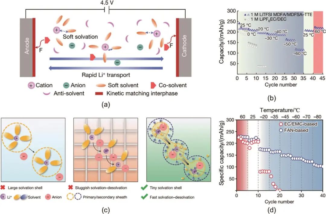 (c) 小尺寸溶劑衍生的快速離子傳輸機理圖;(d) 不同溫度下使用FAN基電解液的石墨/NMC電池的循環(huán)性能