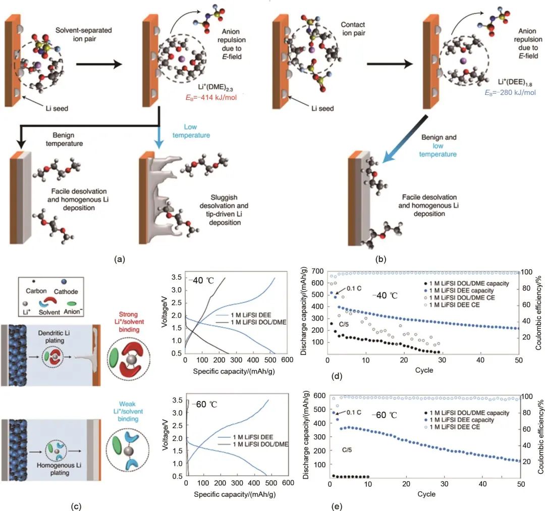 傳統(tǒng)低溫電解液研究大多是針對LIBs,但是因為石墨負極對EC的依賴性和其低溫工作范圍很難降低到-40 ℃以下,所以其實際應用受到了限制。同時值得注意的是傳統(tǒng)低溫電解液研究大多是針對低溫放電容量性能的提升,對于其低溫充電和低溫循環(huán)性能的研究很少,少數(shù)涉及循環(huán)性能的研究也都是采用室溫充電、低溫放電的循環(huán)模式。這主要是因為LIBs在低溫充電過程中石墨負極會發(fā)生鋰沉積,嚴重限制鋰離子在負極中的擴散和電池整體的安全性,從而導致其低溫充電性能遠遠不如低溫放電性能。石墨負極在低溫下的種種限制,使其成為了LIBs低溫性能難以進一步提升的根本原因。近幾年在不斷追求更高能量密度的儲能裝置的社會背景下,以鋰金屬電池為代表的下一代鋰電池獲得了廣泛的關注。LMBs相較于LIBs有明顯更高的能量密度,且由于不再使用石墨負極,其電解液不再嚴格需要一定含量的EC,轉而可以使用醚類等具有更好低溫性能的電解液組分,使得在探尋LMBs低溫電解液時有更多的可能性。但是由于低溫下受阻的離子傳輸和過大的極化效應,使得鋰金屬負極更容易發(fā)生不均勻的鋰金屬沉積導致嚴重的鋰枝晶生長,在研究LMBs低溫電解液時電池的安全性需要更加重視。同時,隨著能源市場的技術要求不斷升級,低溫電池的性能探索也不再局限于提升單次低溫放電的容量保持率,研究人員希望通過對電池電解液的設計來實現(xiàn)低溫環(huán)境下的高效穩(wěn)定循環(huán)。總的來看,新型低溫鋰電池電解液設計更加聚焦于鋰金屬電池電解液,希望對充放電過程中鋰離子遷移機理進行優(yōu)化,從根本上理解鋰電池的低溫性能提升方法,實現(xiàn)鋰電池的長壽命高效低溫充放電循環(huán)。