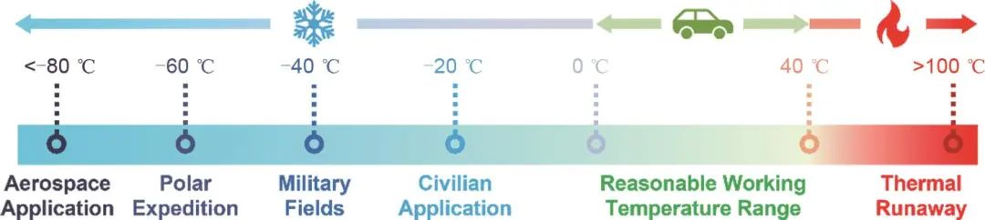 除了對能量密度的要求外,對鋰電池在特殊環(huán)境下的使用性能要求也越來越高。近年來,鋰電池在低溫環(huán)境下的性能受到了廣泛的關注。圖1展示了應用于不同領域的鋰電池所需的有效工作溫度范圍,在寒冷的季節(jié)或嚴寒地區(qū),消費電子或電動汽車上的民用鋰電池需要適應接近-20 ℃的低溫并要求進行穩(wěn)定的電池充放電,而使用在軍事或航空航天領域的電化學儲能系統(tǒng)的使用環(huán)境溫度甚至低于-60 ℃,但是目前普遍商業(yè)化使用的碳酸酯基電解液在-20 ℃時會發(fā)生電導率下降、黏度上升,甚至凝固等現(xiàn)象,引發(fā)電池嚴重的容量衰退、壽命減短和充電困難,這限制了現(xiàn)有鋰離子電池在低溫條件下的使用。因此如何抑制鋰電池在低溫下的容量衰退,提高其在低溫下的使用壽命和循環(huán)穩(wěn)定性,是鋰電池未來發(fā)展中的一個最重要的挑戰(zhàn)。