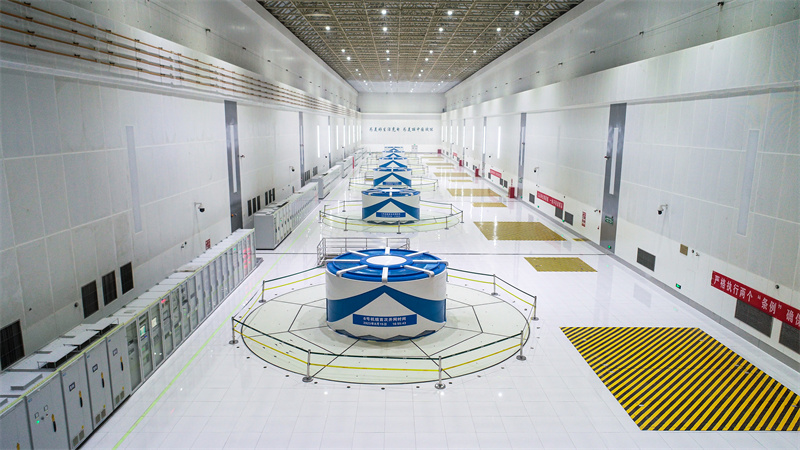 走進(jìn)文登抽水蓄能電站地下廠房,潔白的大廳內(nèi)6臺(tái)機(jī)組一字排開,機(jī)罩側(cè)面描繪著藍(lán)色波濤圖形。2023年9月19日,國網(wǎng)新源山東文登抽水蓄能電站最后一臺(tái)機(jī)組——6號(hào)機(jī)組正式投入商業(yè)運(yùn)營,標(biāo)志著山東省內(nèi)裝機(jī)規(guī)模最大、膠東地區(qū)首座抽水蓄能電站全面投產(chǎn)發(fā)電。