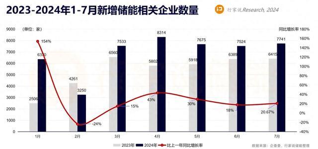 儲(chǔ)能設(shè)備相關(guān)企業(yè)中,4月新增量最多,達(dá)7174家,比去年同期增47.55%;5月、6月、7月新增量有所下滑,維持在6400-6600之間。與2023年同期相比,1月新增幅度最大,增速超1.5倍多。