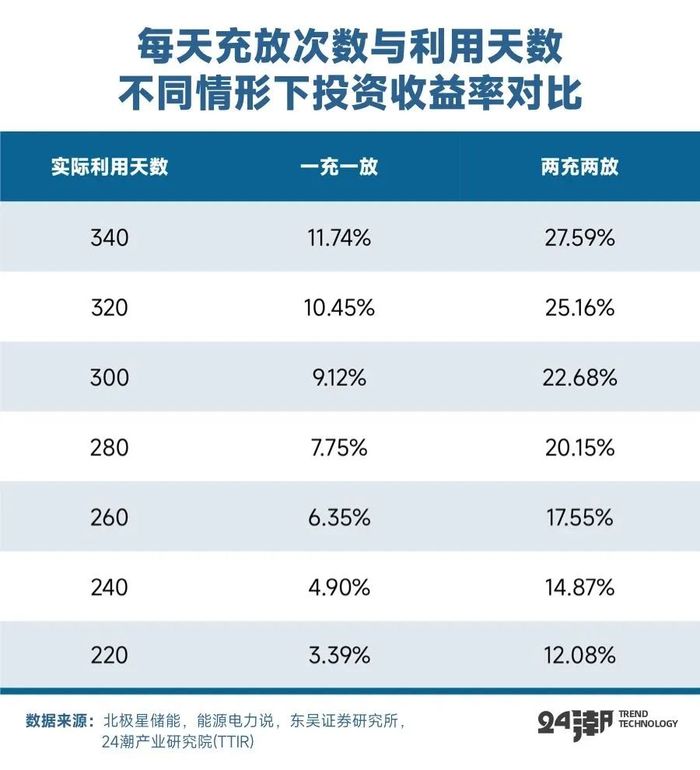 還需要注意的是,據(jù)東吳證券測(cè)算,工商儲(chǔ)實(shí)際應(yīng)用中收益率低于理論值,對(duì)工商業(yè)業(yè)主吸引力有限。工商儲(chǔ)單個(gè)項(xiàng)目功率較大,初始投資成本約上千萬(wàn)元,此外分時(shí)電價(jià)政策變化的不確定性、若實(shí)際利用天數(shù)較低,收益率將打較大折扣,每天同一充放次數(shù)下,220天利用天數(shù)與340天利用天數(shù)可產(chǎn)生近2倍收益率差異。考慮目前實(shí)際利用是一充一放為主,280利用天數(shù)下IRR為7.75%。