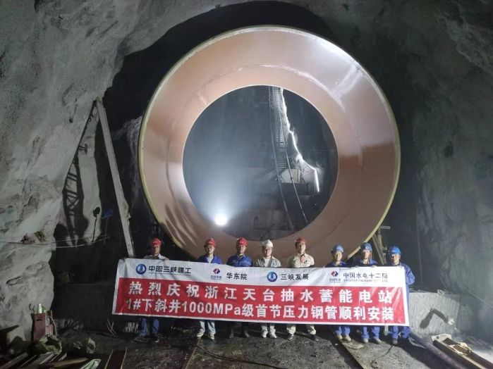 9月29日,天臺(tái)抽蓄電站1號(hào)下斜井首節(jié)壓力鋼管也實(shí)現(xiàn)順利安裝,拉開(kāi)了國(guó)內(nèi)最長(zhǎng)單級(jí)斜井安裝序幕。據(jù)了解,1號(hào)下斜井長(zhǎng)度483米,其中上彎段和直線(xiàn)段采用800兆帕級(jí)鋼板襯砌,下彎段采用1000兆帕級(jí)鋼板襯砌。