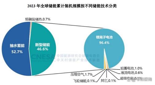 據(jù)CNESA統(tǒng)計(jì),截至2023年底全球新型儲(chǔ)能市場(chǎng)累計(jì)裝機(jī)規(guī)模約為91.326GW,較上一年末增長(zhǎng)99.6%,其中鋰離子電池儲(chǔ)能市場(chǎng)份額96.9%,占據(jù)絕對(duì)主導(dǎo)地位。