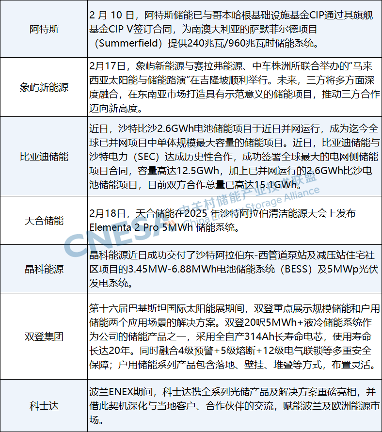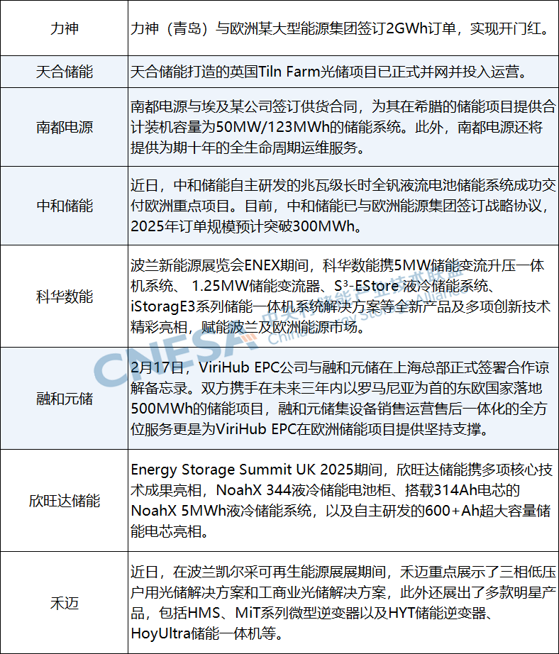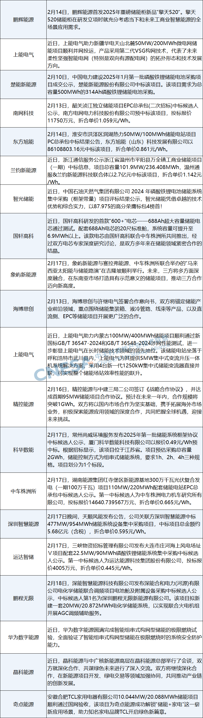 近兩周來,楚能新能源、南網(wǎng)科技、中車株洲所、蘭鈞新能源、智光儲能、科華數(shù)能、運達(dá)智儲、鵬程無限等企業(yè)中標(biāo)國內(nèi)儲能項目采購;上能電氣、奇點能源等項目順利并網(wǎng);華為數(shù)字能源圓滿完成智能組串式構(gòu)網(wǎng)型儲能的極限燃燒試驗;晶科能源與中廣核新能源深化了合作;鵬輝能源首發(fā)2025年工商業(yè)儲能柜新品“擎天520“;海博思創(chuàng)與許繼電氣錨定儲能產(chǎn)業(yè)前沿領(lǐng)域開展廣泛合作等等,國內(nèi)市場在招中標(biāo)、戰(zhàn)略合作、新品發(fā)布等方面全面出擊。