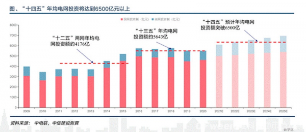 南方電網(wǎng)在“十四五”期間的計劃是總投約6700億元,較“十三五”總投資增長約22%。兩者合計總投資就高達2.9萬億元,如果算上地區(qū)電網(wǎng)公司,“十四五”期間全國電網(wǎng)總投資預(yù)計達到3萬億元。