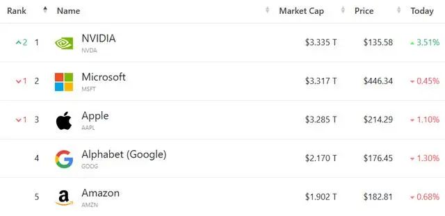 當(dāng)?shù)貢r(shí)間周二美股收盤,美國(guó)芯片企業(yè)英偉達(dá)上漲3.51%,報(bào)135.58美元再刷歷史新高,總市值達(dá)3.335萬(wàn)億美元,一舉超過(guò)了微軟和蘋果,成為全球最具價(jià)值的上市公司。