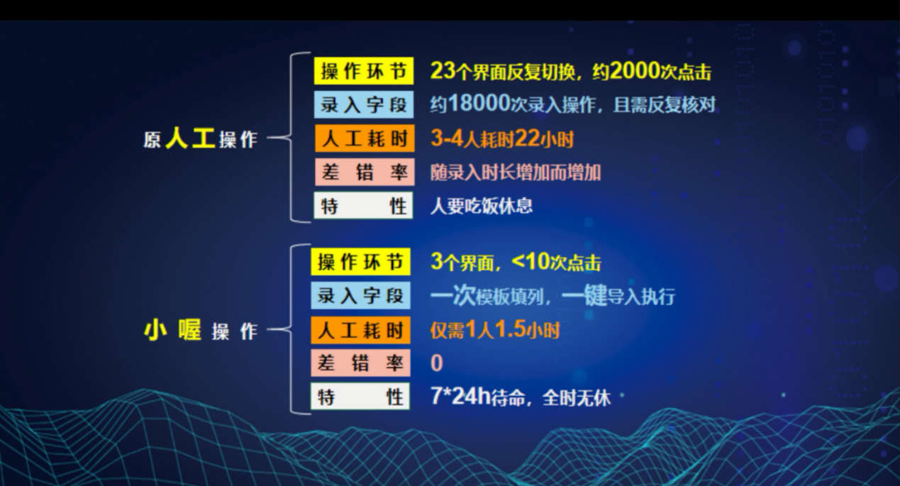 在國網(wǎng)四川電力,基于人工智能的“小喔”機器人也發(fā)揮著它的巨大作用。“在我們供電所班組,以前電能表批量裝換的信息錄入業(yè)務(wù)每天需3-4人共同完成22小時工作量,現(xiàn)在有了小喔”機器人,只需1人1小時便完成了數(shù)據(jù)整理,0.5小時數(shù)據(jù)導(dǎo)入,僅需3個操作步驟,總耗時節(jié)省90%以上。我們有了更多的時間去開展高附加值的工作,去提升客戶服務(wù)的滿意度。”國網(wǎng)四川電力城東供電服務(wù)中心營銷主任鮮春林主任點擊了兩下電腦屏幕轉(zhuǎn)身開心的對我們說。