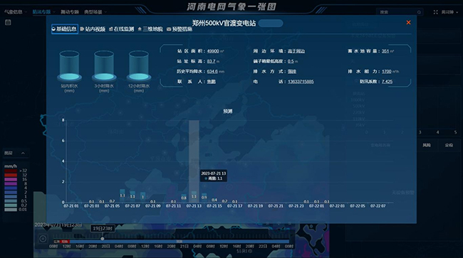 “一張圖”建設(shè)以電網(wǎng)氣象災(zāi)害風(fēng)險(xiǎn)預(yù)報(bào)預(yù)警模型為核心,集夏季防汛、冬季覆冰舞動(dòng)、春秋季風(fēng)災(zāi)等多種電網(wǎng)氣象災(zāi)害風(fēng)險(xiǎn)預(yù)報(bào)預(yù)警于一體,預(yù)警信息的地理精度可具體到變電站、線路桿塔。通過平臺(tái)可實(shí)時(shí)捕捉電網(wǎng)設(shè)備的氣象要素監(jiān)測(cè)和預(yù)報(bào)信息,以及變電站周邊環(huán)境監(jiān)控等。當(dāng)出現(xiàn)重大天氣過程時(shí),平臺(tái)根據(jù)不同風(fēng)險(xiǎn)等級(jí)預(yù)測(cè),動(dòng)態(tài)提供“一站一策式”的24小時(shí)、72小時(shí)內(nèi)應(yīng)對(duì)措施建議。