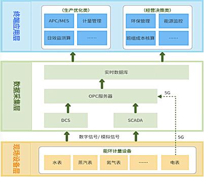 該體系主要由現(xiàn)場(chǎng)設(shè)備層、數(shù)據(jù)采集層、終端應(yīng)用層等組成。他們根據(jù)工藝與計(jì)量要求,先后配備了帶信號(hào)遠(yuǎn)傳功能、高準(zhǔn)確度等級(jí)的質(zhì)量流量計(jì)、電磁流量計(jì)、超聲波流量計(jì)等智能型計(jì)量?jī)x表,實(shí)現(xiàn)一、二級(jí)能源計(jì)量表配備率達(dá)100%。通過計(jì)量?jī)x表傳輸端采集能源計(jì)量數(shù)據(jù),上傳至DCS或SCADA系統(tǒng),再通過OPC接口上傳至實(shí)時(shí)數(shù)據(jù)庫,采用5G無線傳輸技術(shù)解決偏遠(yuǎn)區(qū)域計(jì)量?jī)x表信號(hào)的數(shù)據(jù)采集與傳輸,最終為終端系統(tǒng)提供有效數(shù)據(jù)支持。