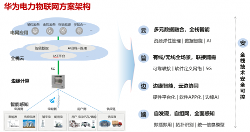 華為構(gòu)建了“云管邊端”的電力物聯(lián)網(wǎng)方案架構(gòu),并且由端到云全棧技術安全可控?!霸啤庇蒊oT平臺、智能數(shù)據(jù)和AI共同構(gòu)建數(shù)字化底座,并支撐電網(wǎng)業(yè)務云化應用;“管”提供可靠聯(lián)接,有線/無線全場景隨需靈活聯(lián)接;“邊”具備邊緣計算、云邊協(xié)同和AI能力;“端”全面感知電網(wǎng)信息,支持自描述、自發(fā)現(xiàn)和即插即用。