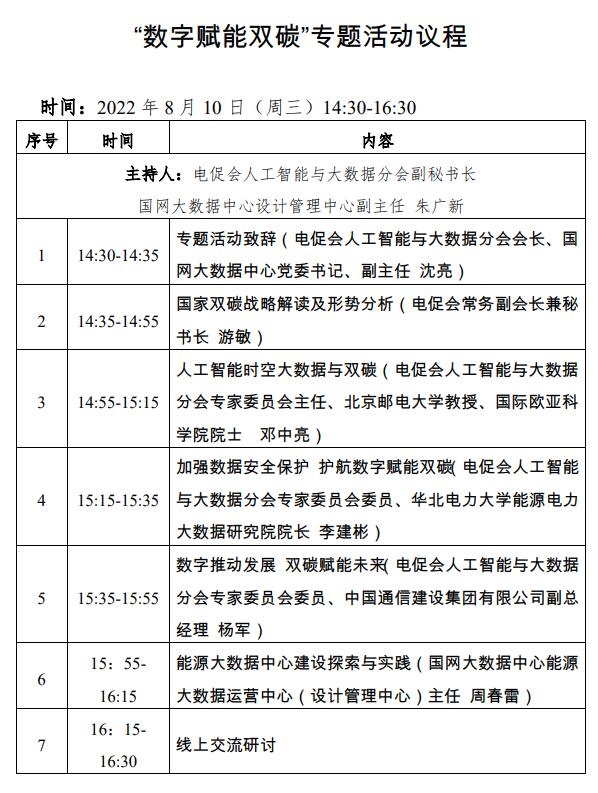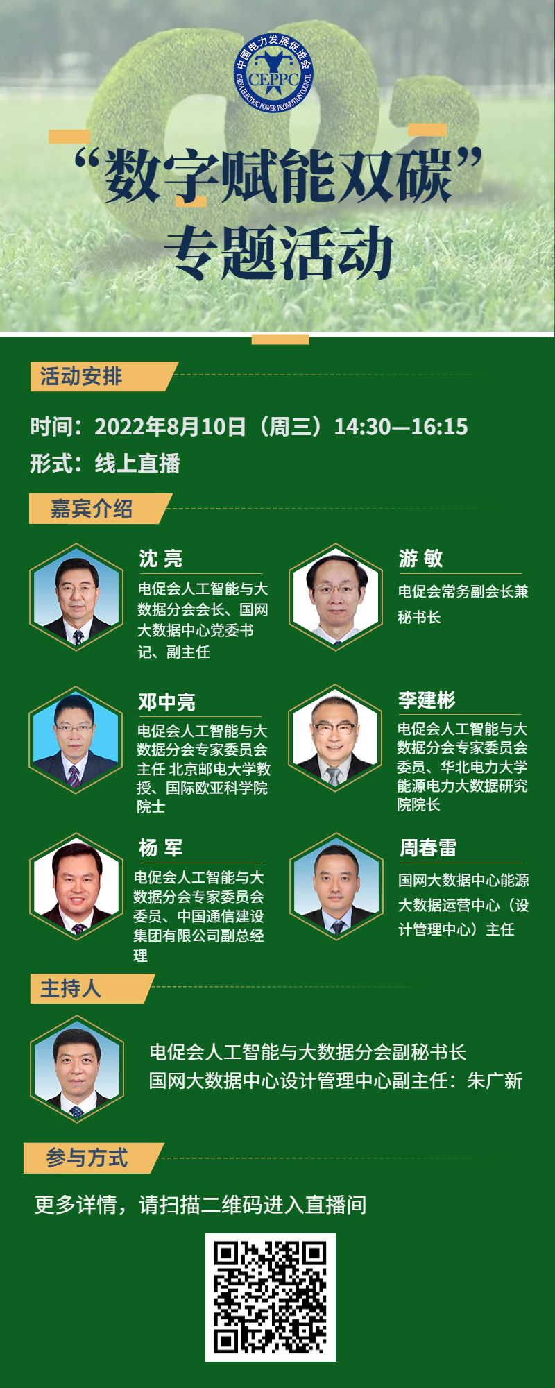 8月10日下午2點(diǎn)半,數(shù)字賦能雙碳線上沙龍直播,中國(guó)電力發(fā)展促進(jìn)會(huì)大數(shù)據(jù)與人工智能分會(huì)邀您參加!國(guó)網(wǎng)大數(shù)據(jù)中心領(lǐng)導(dǎo)、電促會(huì)領(lǐng)導(dǎo)、歐亞科學(xué)院院士北京郵電大學(xué)教授、華北電力大學(xué)教授、中國(guó)通信建設(shè)集團(tuán)領(lǐng)導(dǎo)等嘉賓將分享數(shù)字技術(shù)和數(shù)據(jù)如何服務(wù)雙碳目標(biāo)實(shí)現(xiàn)。